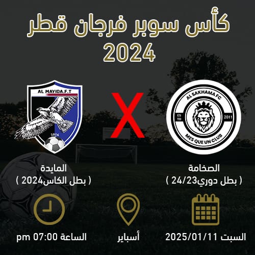 بمشاركة 11 فريق ينطلق دوري فرجان قطر لموسم 2026/2025 يوم الأحد بعد القادم الموافق 2025/10/12 بلقاء يجمع فريق أهل فلسطين مع منتخب فرجان قطر بلقاء ودي بأفتتاح الموسم الرابعة عشرة ، و بعد المباراة الأفتتاحية سوف ينطلق الدوري بلقاء أول يجمع فريق الخيسة و فريق القلايل ( الكاس ) الفريقان الجدد على الدوري الذي إنطلق …